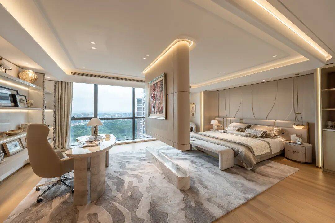 约91㎡总统主卧套间,内部有书房、衣帽间、独立卫浴,连通观景阳台,可以说,关起来门来,就是一个小世界。