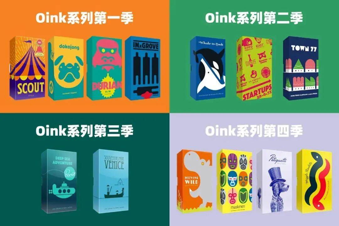 自2023年为大家带来由《马戏星探》《榴莲忘贩》《夺狗囧事》《竹林之中》领衔的OINK首季游戏后,asmodee又在此后两年里先后为大家带来包括《新创公司》《赏鲸奇探》《面具摔跤手》《狂野迁徙》在内的9款OINK旗下游戏,并通过这些游戏包含有趣游戏体验为无数玩家送上了欢乐美好的体验过程~