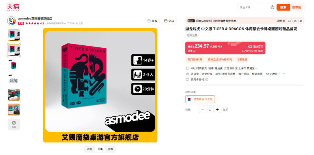 在入手形式方面,本次登场的《游龙戏虎》也可以同步触发双十一85折单件优惠以及天猫88会员9折优惠券: