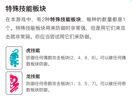 类似于很多棋牌游戏中的“万能牌”或者“王牌”,【龙技能】及【虎技能】牌分别用于防守其他玩家向你打出的奇数或偶数进攻行动。
