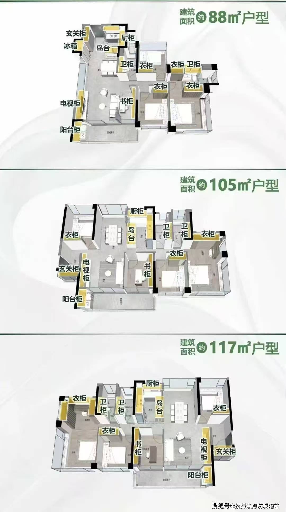 项目主推88-117㎡四房户型,采用“超新规”设计标准,得房率超130%(海珠区新房平均得房率85%)。