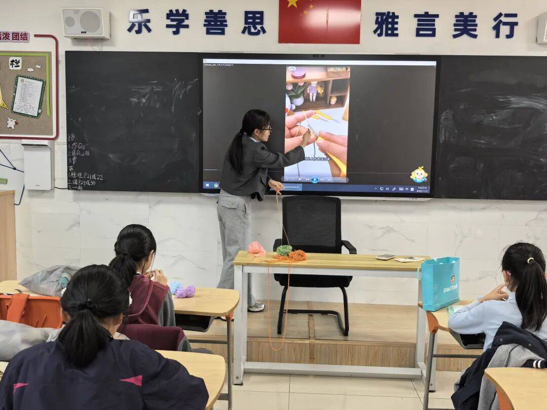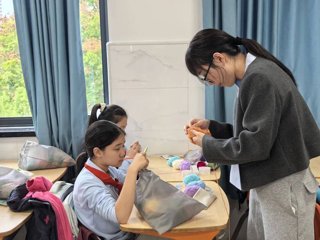 孩子们计算针数、规划结构,动手尝试。过程中有孩子提问:“老师,我钩到第五圈了,该怎么加针才能让它平着展开,不要卷起来?”——这其实正是在解决“周长均匀增长”的数学问题。课堂没有严肃的板书,只有热烈的讨论、互助的身影,以及偶尔因为成功钩出一片匀称花瓣而发出的欢呼。