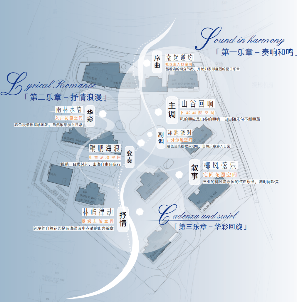 通过「潮起邀约」、「山水谷响」、「泳池派对」 、「椰风弦乐」、「林屿律动」、「鲲鹏海浪」、「雨林水韵」 等七大主题景观的层层递进,营造出移步景异、富有韵律的沉浸式体验,让每一次归家,都成为一场唤醒感官的诗意巡礼。