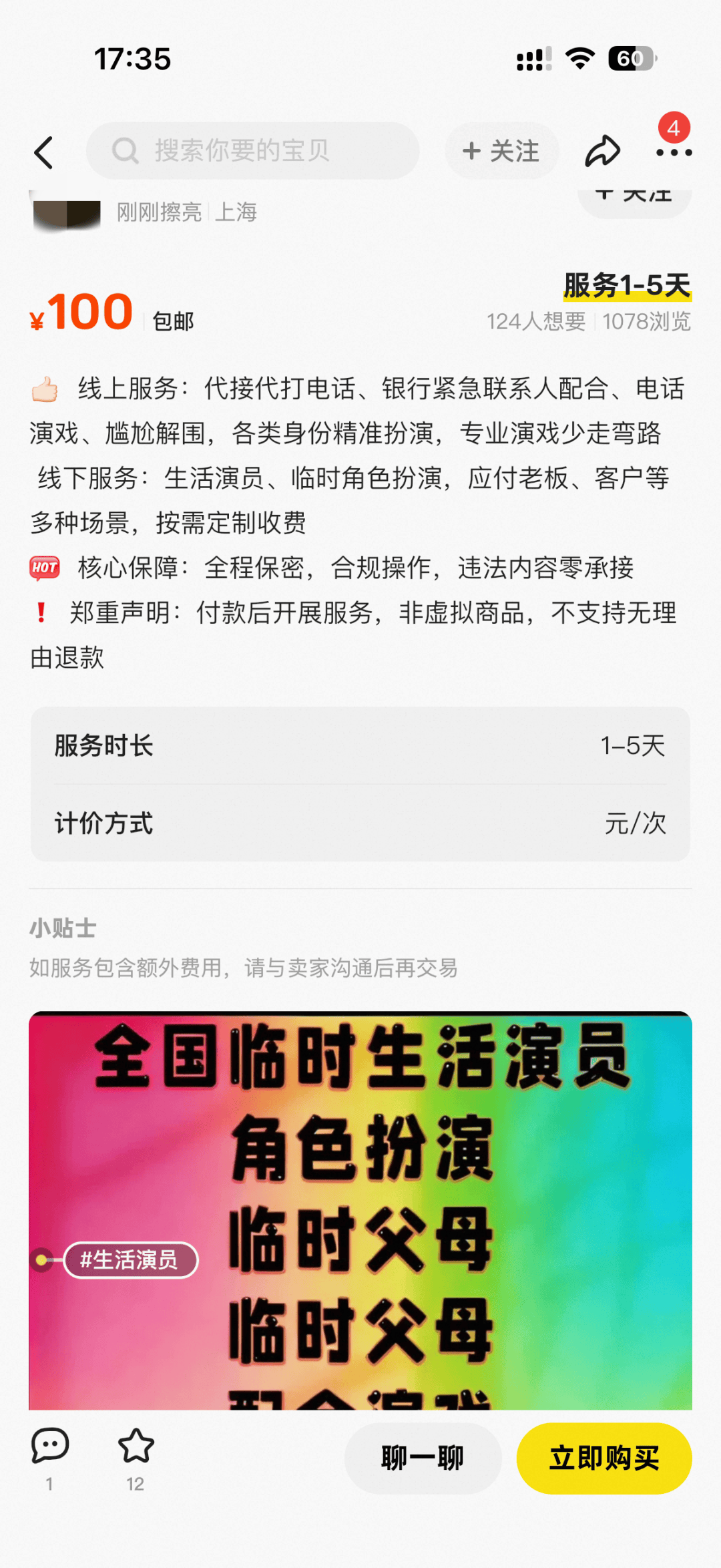 记者发现,在某二手交易平台,有多个商家提供演员假扮情侣的业务,页面显示有上百人询价。