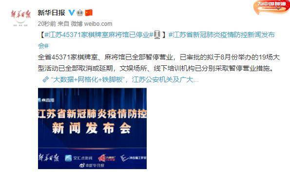 江苏省公安厅党委副书记、常务副厅长尚建荣8月3日在发布会上称,目前,江苏全省45371家棋牌室、麻将馆已全部暂停营业。