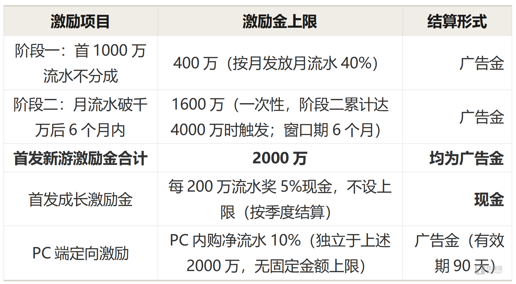 一个值得注意的细节是:阶段二的1600万一次性广告金,触发条件是游戏进入阶段二后累计流水达到4000万。也就是说,只有当一款游戏的总流水达到5000万(阶段一的1000万+阶段二的4000万)时,才能拿到完整的2000万激励上限。