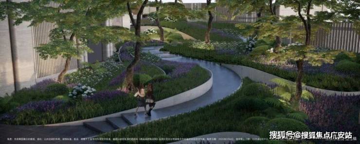 通过景观设计,将小区景打造成了立体台地花园,设置缓坡、下沉式花园、台阶等,让整体景观表现出立体层次感,错落有致。