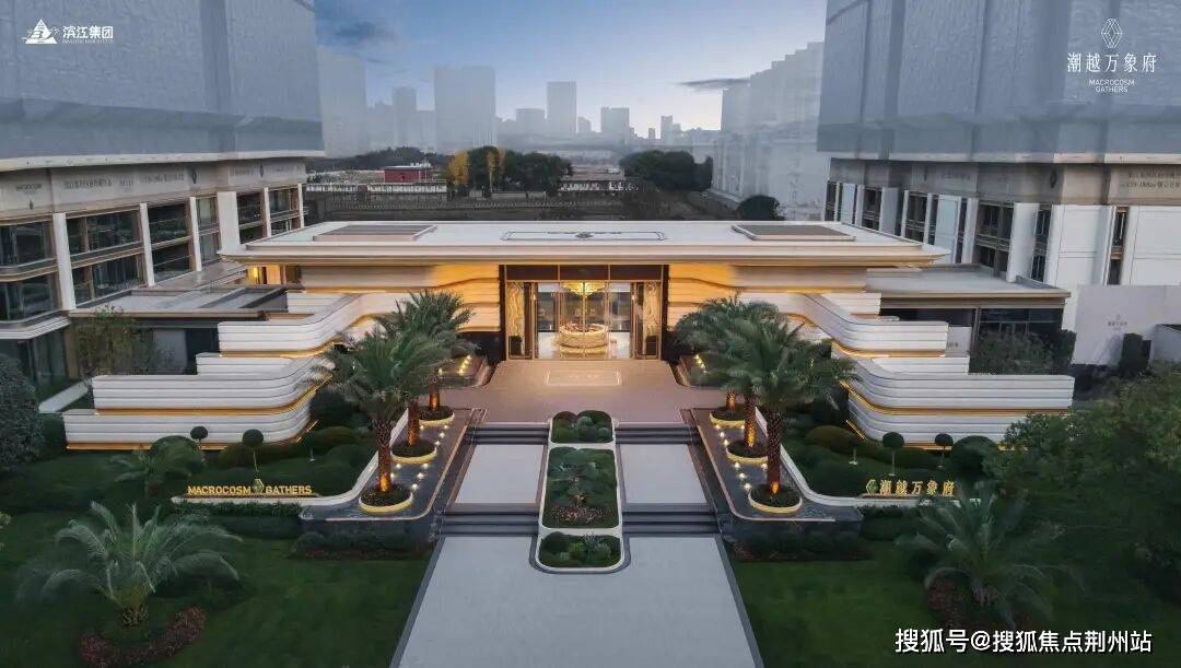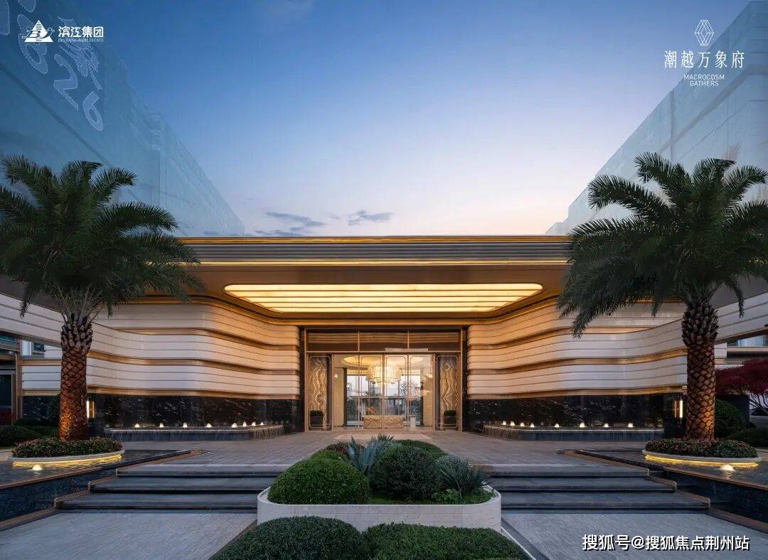 约37米进深的归家门头,灵感源自迪拜卓美亚港湾酒店,六棵变异银海枣价值超百万,头顶的“金顶官檐”与萧山开元大酒店遥相呼应。